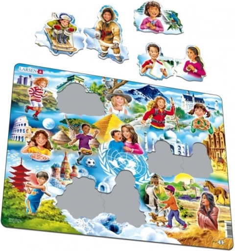 Podajte se na potovanje čez celine s sestavljanko LARSEN, kjer se bodo otroci spoznali s prijatelji iz Egipta, Nemčije, Italije, Kitajske in drugih držav. Zaradi nepravilnih koščkov brez klasičnih zatičev je sestavljanje intuitivno in zabavno – kot bi se slika “razpočila” na edinstvene dele.