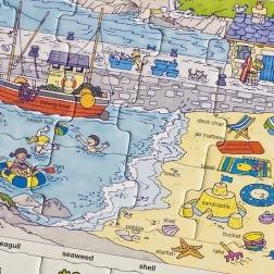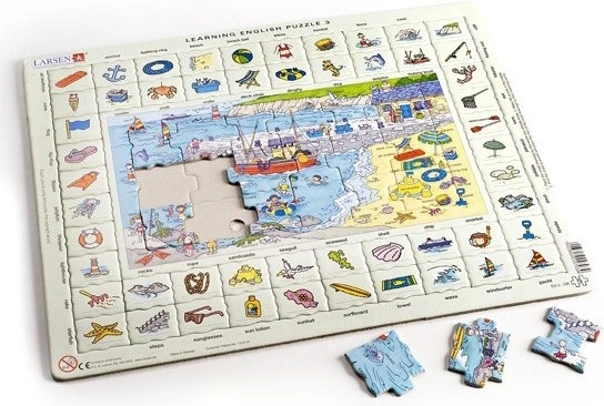 Odkrijte, kaj vse lahko najdete na plaži, in se naučite poimenovati vodne športe s to zabavno sestavljanko. Vsak košček predstavlja drugo besedo, ki jo je treba pravilno povezati z ustrezno sliko na robu sestavljanke. Sestavljanka vsebuje 18 koščkov v sredini, ki tvorijo celotno sceno z učnimi besedami v angleščini. Otroci lahko besede poiščejo na sliki za boljše razumevanje.