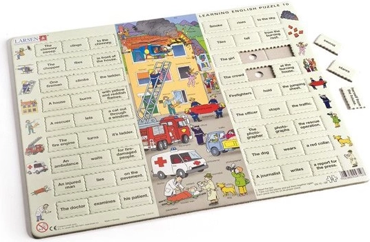 Larsen učni puzzle so idealna izbira za otroke, ki se želijo igrivo učiti angleškega jezika. Vsebuje 54 kosov za sestavljanje stavkov, ki opisujejo reševalne prizore.