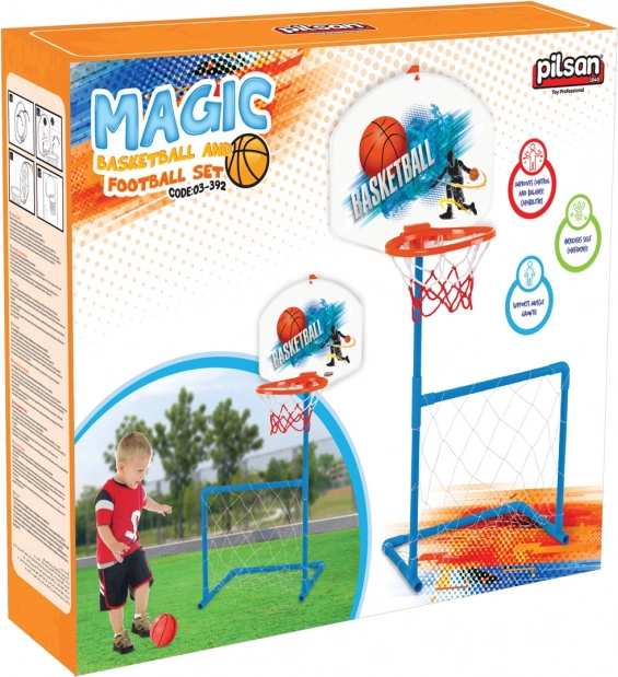Univerzalni športni set 2v1 za otroke in odrasle združuje nogometni gol in koš za košarko v enem. Omogoča igro z originalno košarkarsko žogo, je izdelan iz zdravju neškodljivih materialov in izpolnjuje stroge standarde EU za varno uporabo.