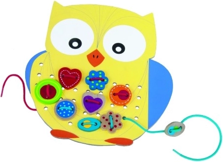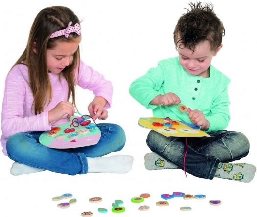 Priljubljena igrača za razvoj fine motorike, domišljije in potrpežljivosti otrok z motivi sove in ribice. Set vsebuje 35 kosov lesenih komponent in 4 vezalke za neskončno zabavo.