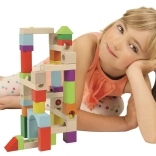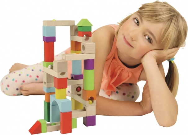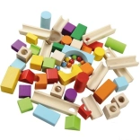 Set barvnih lesenih blokov in stez omogoča neskončne možnosti pri gradnji steze, medtem ko razvija fino motoriko in kreativnost.