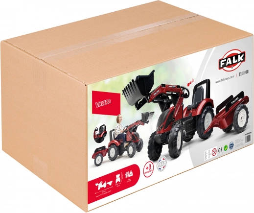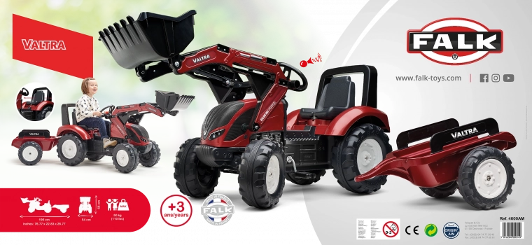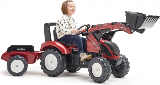 Poganjalni traktor VALTRA znamke FALK bo razveselil vsakega malega kmeta. Ponuja funkcionalno sprednjo žlico za zajemanje, odstranljivo prikolico za prevoz igrač ter hupo na volanu. Zahvaljujoč verižnemu pogonu, stabilni konstrukciji in vzdržljivim plastičnim kolesom je idealen za igro na prostem ter razvoj motorike in koordinacije.