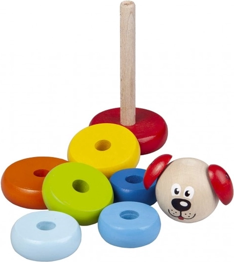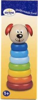 Piramida Kužek Detoa iz lesenih kosov podpira razvoj fine motorike in domišljije pri otrocih že od 1. leta. Izdelana je po strogih varnostnih standardih EU.