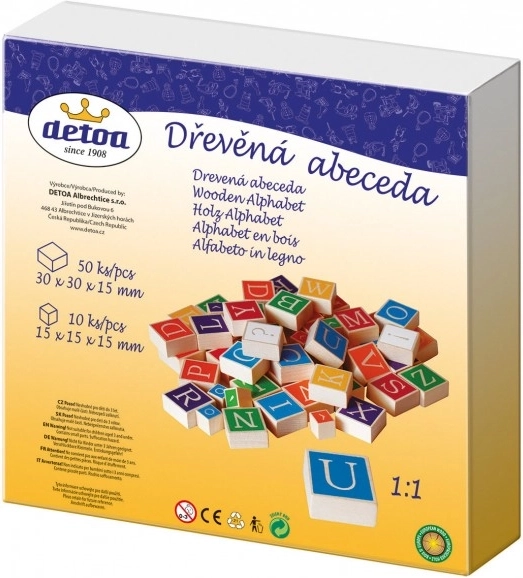 Lesena abeceda znamke Detoa je izobraževalna igrača za otroke od 3. leta, ki pomaga pri prepoznavanju črk in sestavljanju prvih besed. Podpira razvoj fine motorike rok.