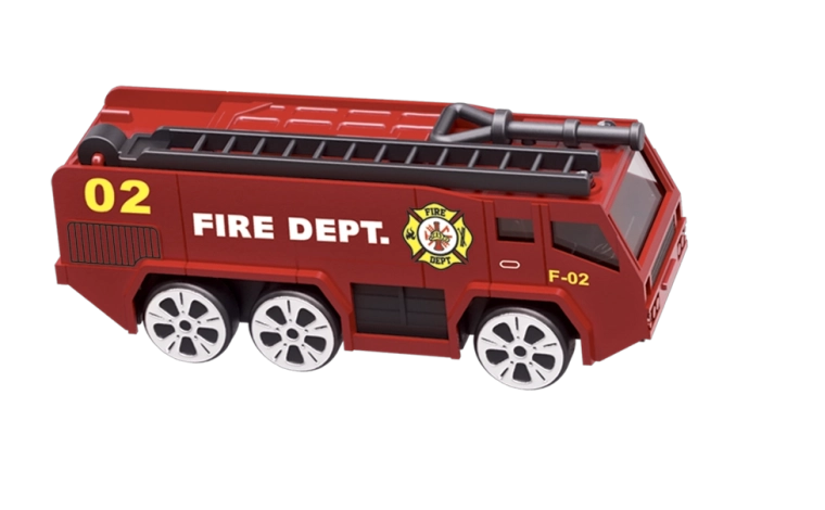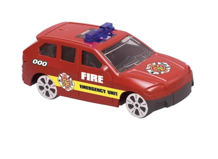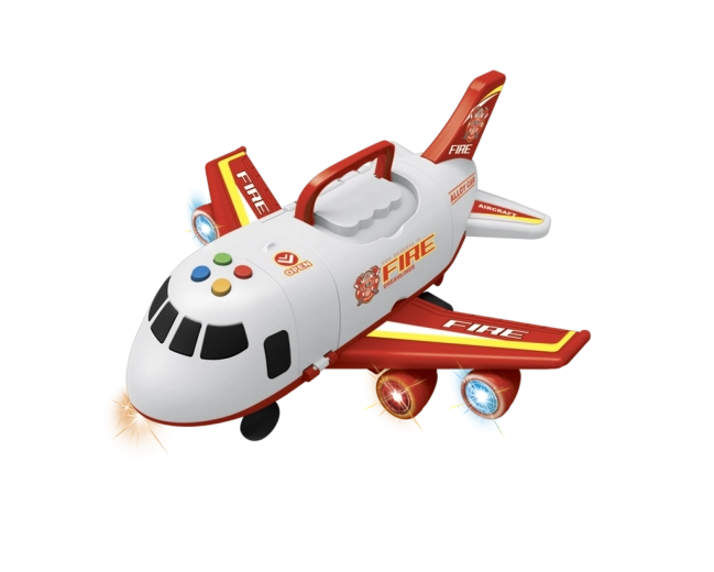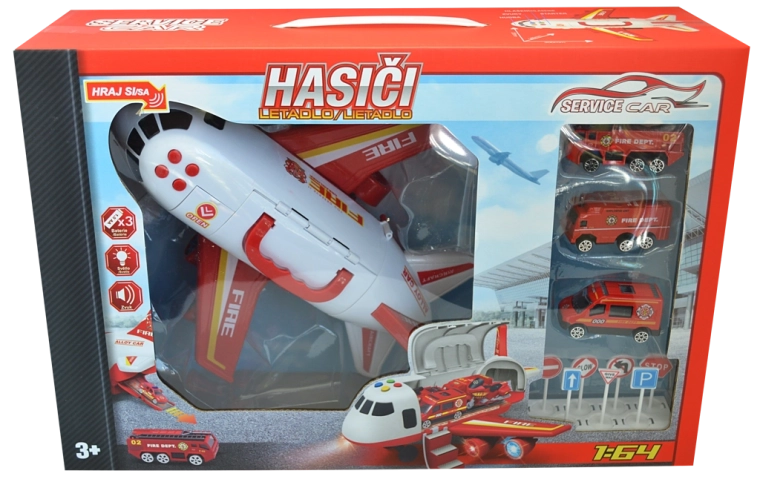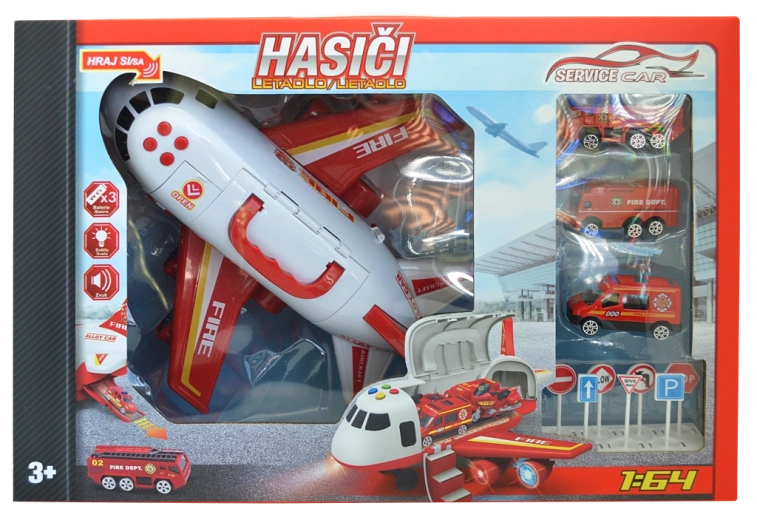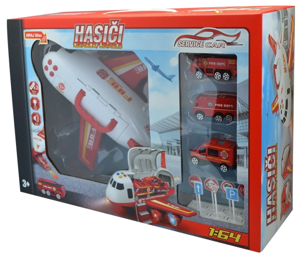 Letalo Gasilska zbirka s pripomočki (set). Dimenzije garaže po razstavitvi: 25 × 28 × 30 cm, gumbi za zvočne in svetlobne učinke, vožnja na vztrajnik. Vsebina seta: gasilsko letalo/garža 2v1 (funkcija preoblikovanja iz letala v garažo in nazaj) ter kovinski model avtomobilčka 1:64 (3 kosi).