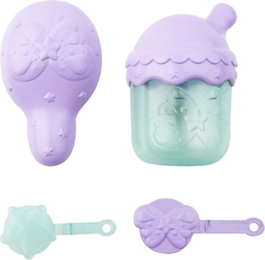 Paket vsebuje 9 tematskih dodatkov, s katerimi boste uživali v domišljijski igri: stekleničko za hranjenje, glavniček, mavrična krila, sponke, nalepke, obesek in potrdilo o posvojitvi. Na voljo so 3 barvne različice (bela, rožnata, modra), tako da si lahko izbere vsak mali čarodej ali čarodejka.