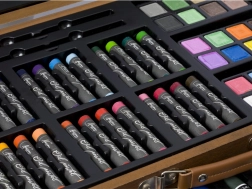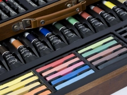 Komplet za slikarje v lesenem kovčku – leseni raztegljivi kovček vsebuje vse za slikarje – barvne krede, barvice, barve, šilček, radirko, čopiče itd., skupaj 112 kosov.