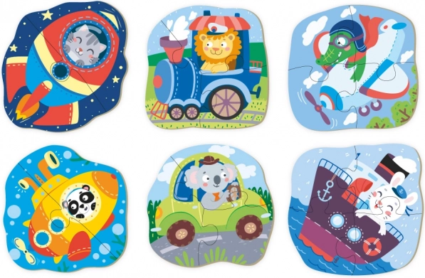Ta komplet vsebuje več malih obrisnih sestavljank z motivi živali in prevoznih sredstev. Zaradi različnega števila koščkov (2–4) otroci napredujejo korak za korakom, pridobivajo samozavest in veselje ob uspehu. Kompaktna dimenzija 13 × 13 cm je idealna za doma in na poti.