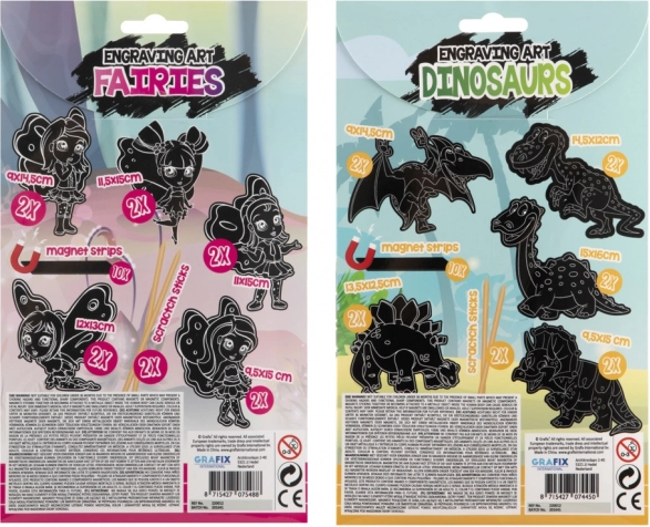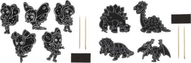 Ta zabaven in ustvarjalen komplet prinaša ure ustvarjanja za majhne in velike. Dovolj je, da nežno postrgate zgornjo plast in razkrijete barvite motive vil ali dinozavrov. Končane izdelke zlahka pritrdite na hladilnik ali drugo kovinsko površino in tako dom okrasite z izvirnimi magnetki.