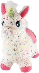 Skakalnik samorog je odličen prijatelj za prve korake in aktivno igro. Stabilno telo iz trpežne gume ter plišasta pralna prevleka z barvnimi zvezdicami zagotavljata udobje in higieno. Ušesa služijo kot ročaji, zato se otrok lahko varno drži in veselo poskakuje doma ali zunaj na mehkih površinah.