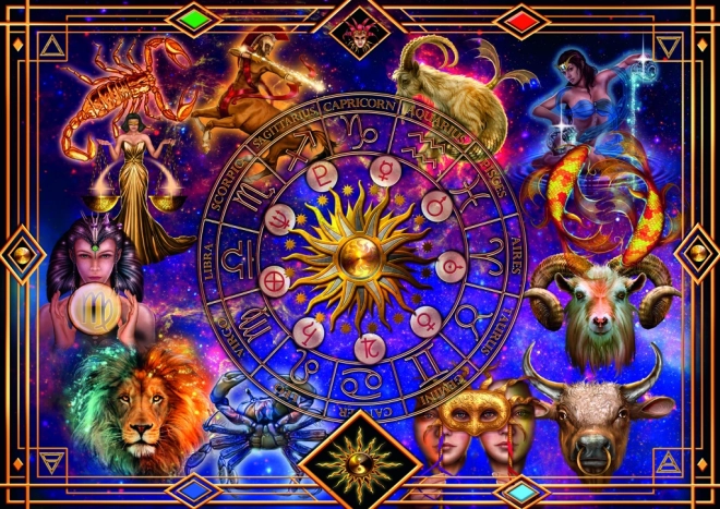 Barvna kompozicija predstavlja vsa znamenja zodiaka v mistični kozmični paleti – idealno za oboževalce astrologije.