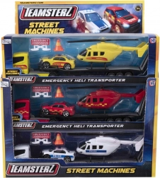 Predstavljamo vam Teamsterz prevoz avtomobila in helikopterja, popoln set za male navdušence nad transportom in reševalnimi akcijami. Vsak set vsebuje tovornjak, ki prevažajo avto in helikopter. Na voljo v treh različnih barvnih izvedbah - rdeča, rumena in bela.