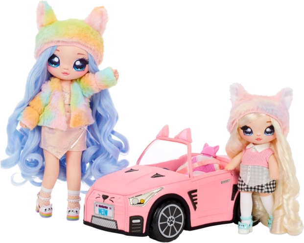 Na! Na! Na! Surprise Stilni kabriolet omogoča punčkam potovati z eleganco in izvirnostjo. Ta mehki tkaninasti avto je zasnovan za udobno in stilsko vožnjo s pravimi vrtljivimi kolesi.