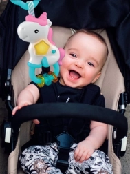 Ljubki samorog Baby Clementoni je idealen sopotnik doma in na poti. Združuje melodije, svetlobne učinke in varne tipne elemente, ki naravno spodbujajo dojenčkovo radovednost in razvijajo njegove čute. Zaradi kompaktnih mer ga lahko vzamete s seboj kamor koli in ga preprosto pritrdite tja, kjer ga otrok najlažje doseže.