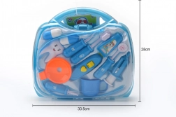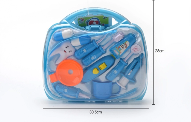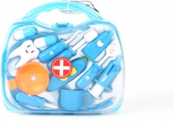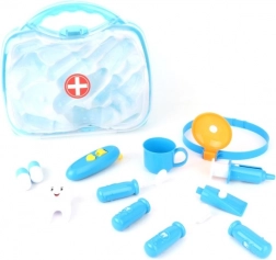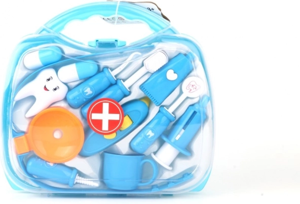 Prozoren moder kovček skriva različne zobne pripomočke, vključno s ščetko, „pasto“ in zobnim modelom. Odlično za vajo higienskih navad in kreativno igro zobozdravnika.