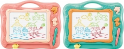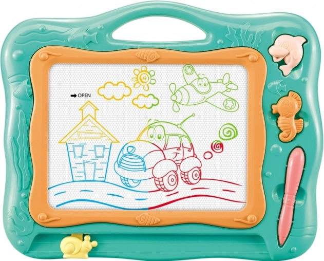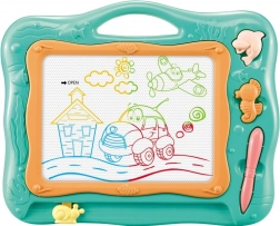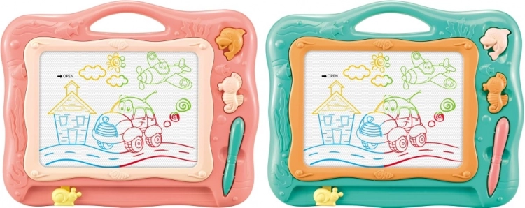 Ta barvita magnetna tablica omogoča otrokom ustvarjanje brez kakršnegakoli nereda – preprosto rišejo s priloženim pisalom in z enim potegom drsnika vse enostavno izbrišejo. Zaradi kompaktne oblike z ročajem jo lahko otroci vzamejo kamor koli – v avto, na obisk ali na počitnice.