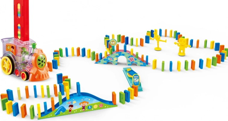 Zabaven vlak z dominami za otroke od 3 let prinaša ure ustvarjalne igre. Premikajoči se vlak samodejno postavlja domine, otroci pa opazujejo njihov spektakularen domino učinek. Spodbuja fino motoriko, ustvarjalnost, zbranost in logično razmišljanje. Potrebuje 2× AA bateriji (nista priloženi).