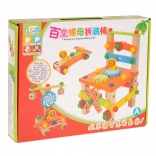 Vključeni so lesen izvijač, ključ, vijaki in matice – otroci se učijo pravilno povezovati dele in razvijajo fino motoriko.