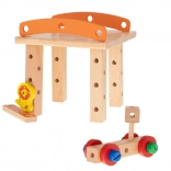 Ta kakovosten leseni komplet omogoča otrokom, da sestavijo delavni stolček in druge izvirne modele. Z vijaki, maticami in zobniki otroci raziskujejo principe preproste mehanike ter urijo zbranost in spretnost. Stolček je stabilen in zaradi premišljenega sistema odprtin ter spojev ponuja veliko kombinacij.