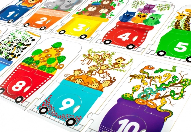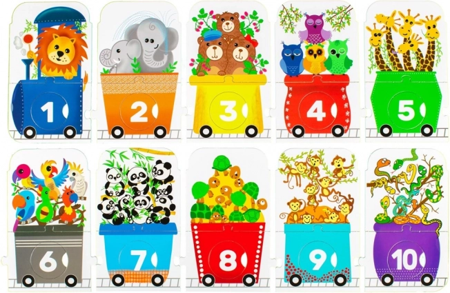 Otroška sestavljanka v obliki vlaka predstavlja zabaven izziv za male raziskovalce. Sestavljena je iz lokomotive in devetih vagonov, vsak z različnim številom živali: