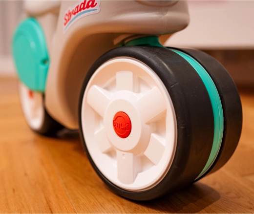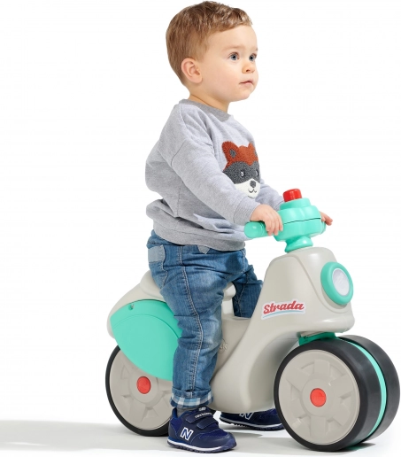 Poganjalec Strada Retro obuja spomine na igrače iz 70. let v novi, moderni preobleki. Idealno za otroke od 1. leta dalje in nosilnost do 25 kg. Zaradi tihih koles, prekritih z elastomerno plastjo, poganjalec nudi gladko in tiho vožnjo, medtem ko široka kolesa zagotavljajo stabilnost.