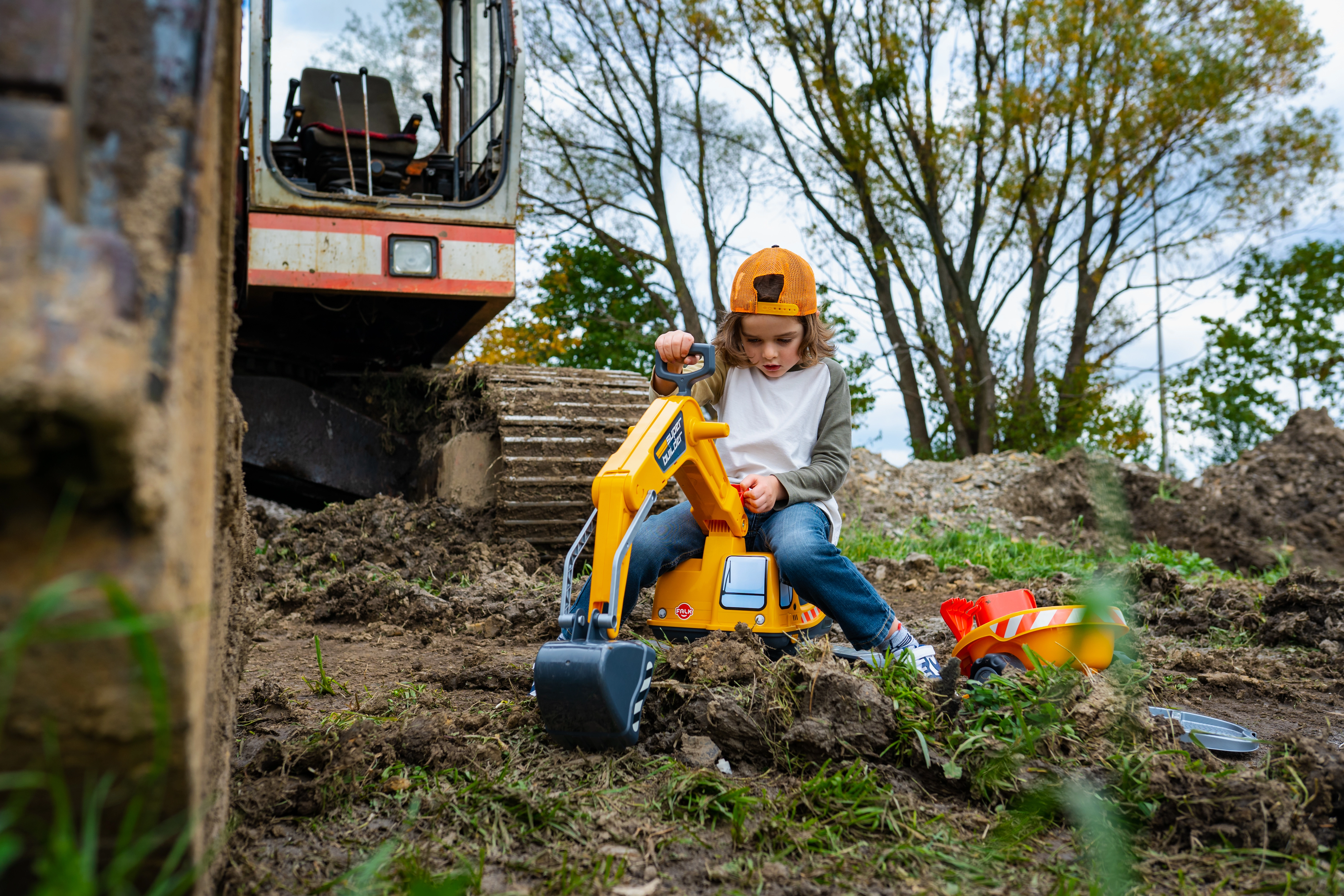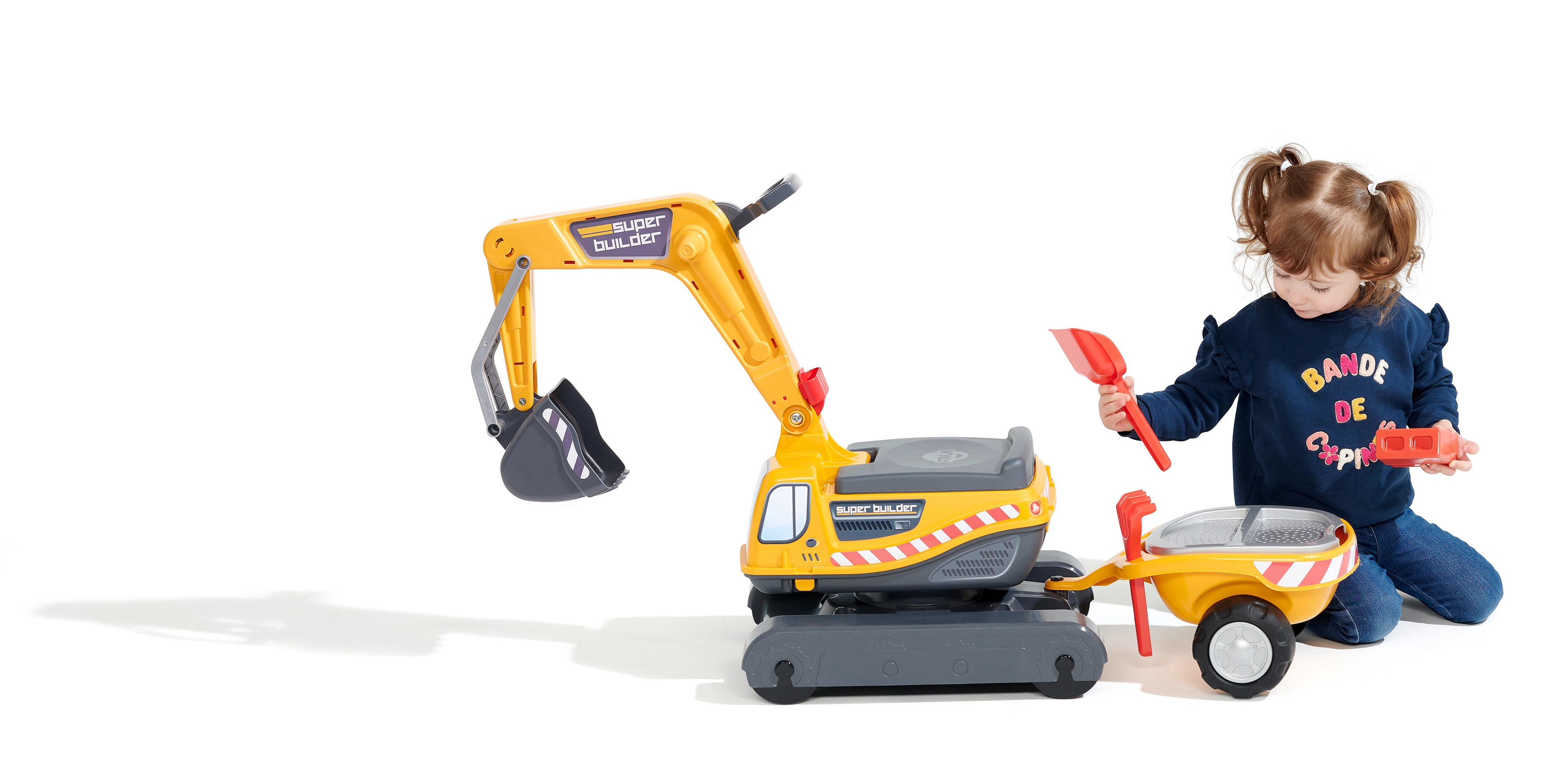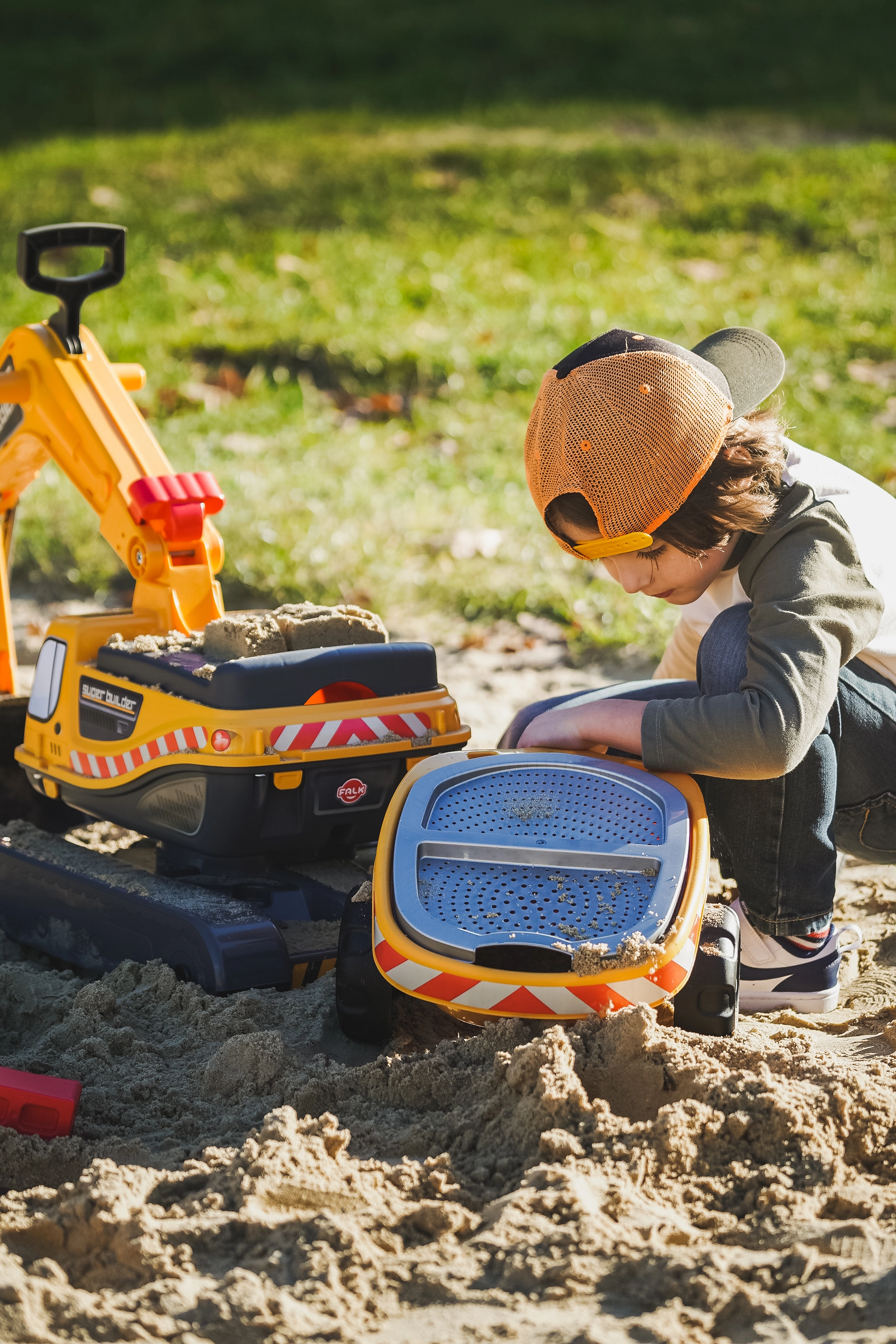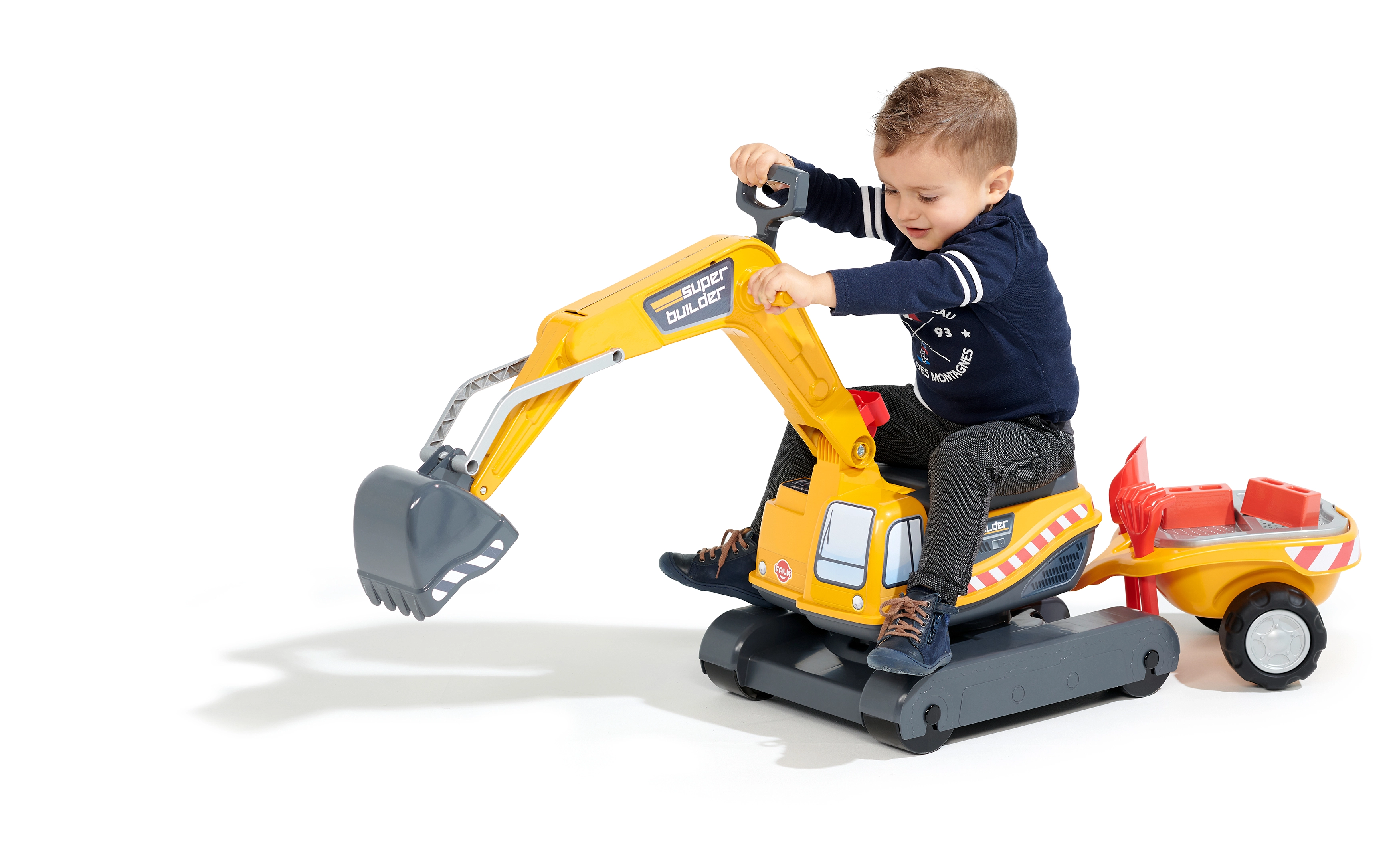 Poganjalec Super gosenicasti bager v oranžni barvi s funkcionalno žlico, imitacijo gosenic, prikolico in igralnim kompletom za pesek – 2× modelček v obliki opeke, lopatka in grabljice. Iz visokokakovostne in odporne plastike. Velikost 85×38×67 cm. Starost 3+. Vsi traktorji Falk so testirani do 50 kg – v skladu z zahtevami evropskih standardov. Izdelano v Franciji.