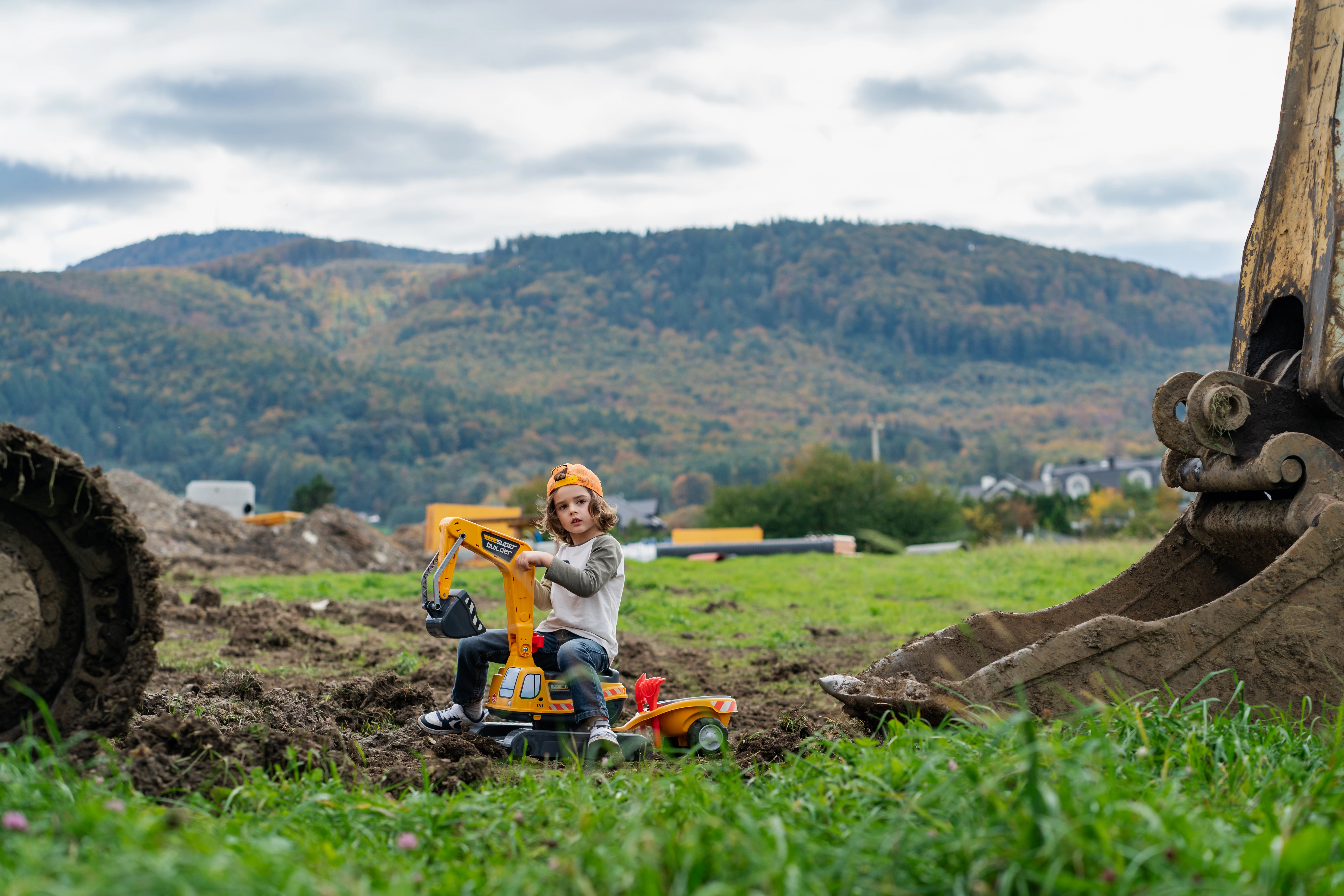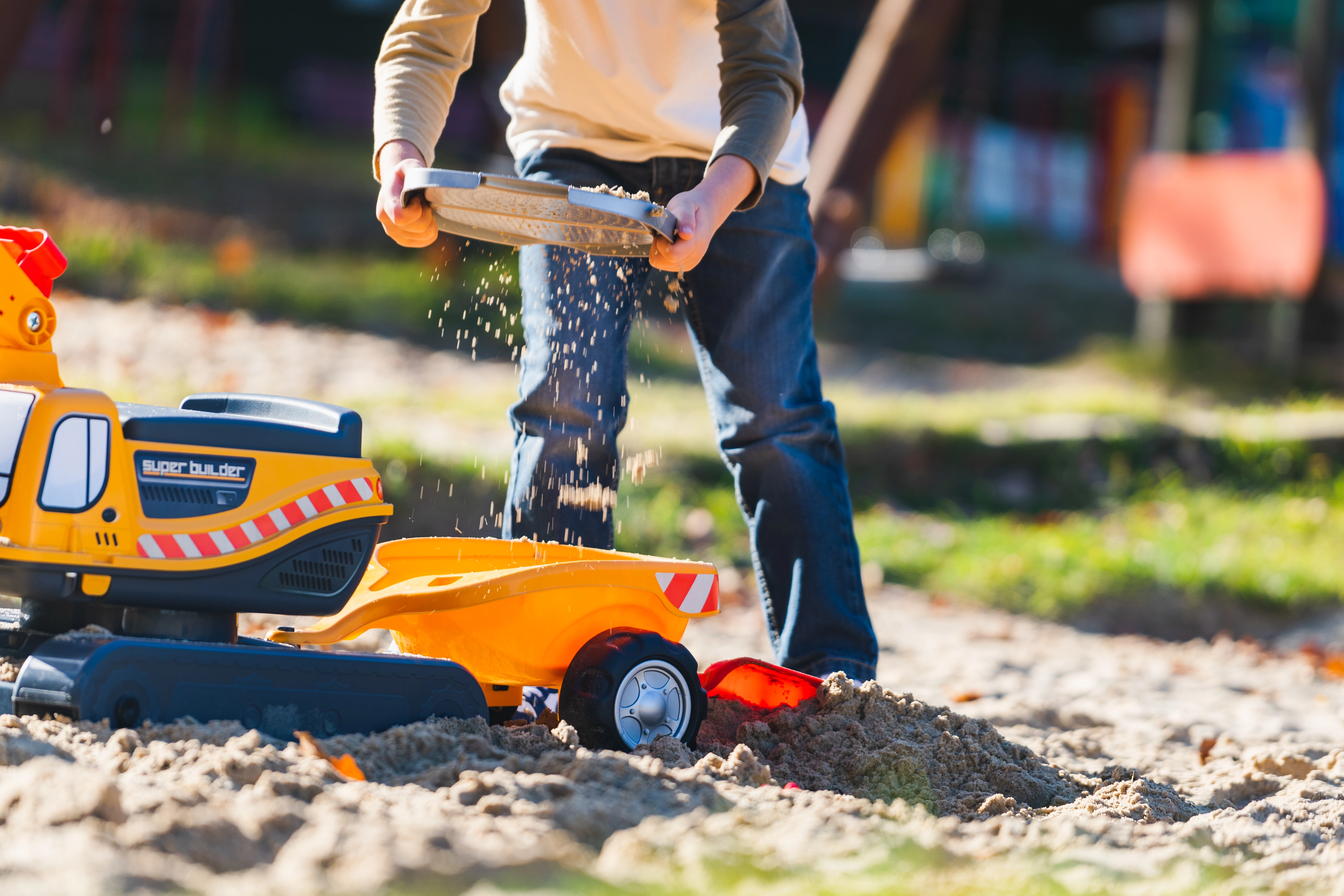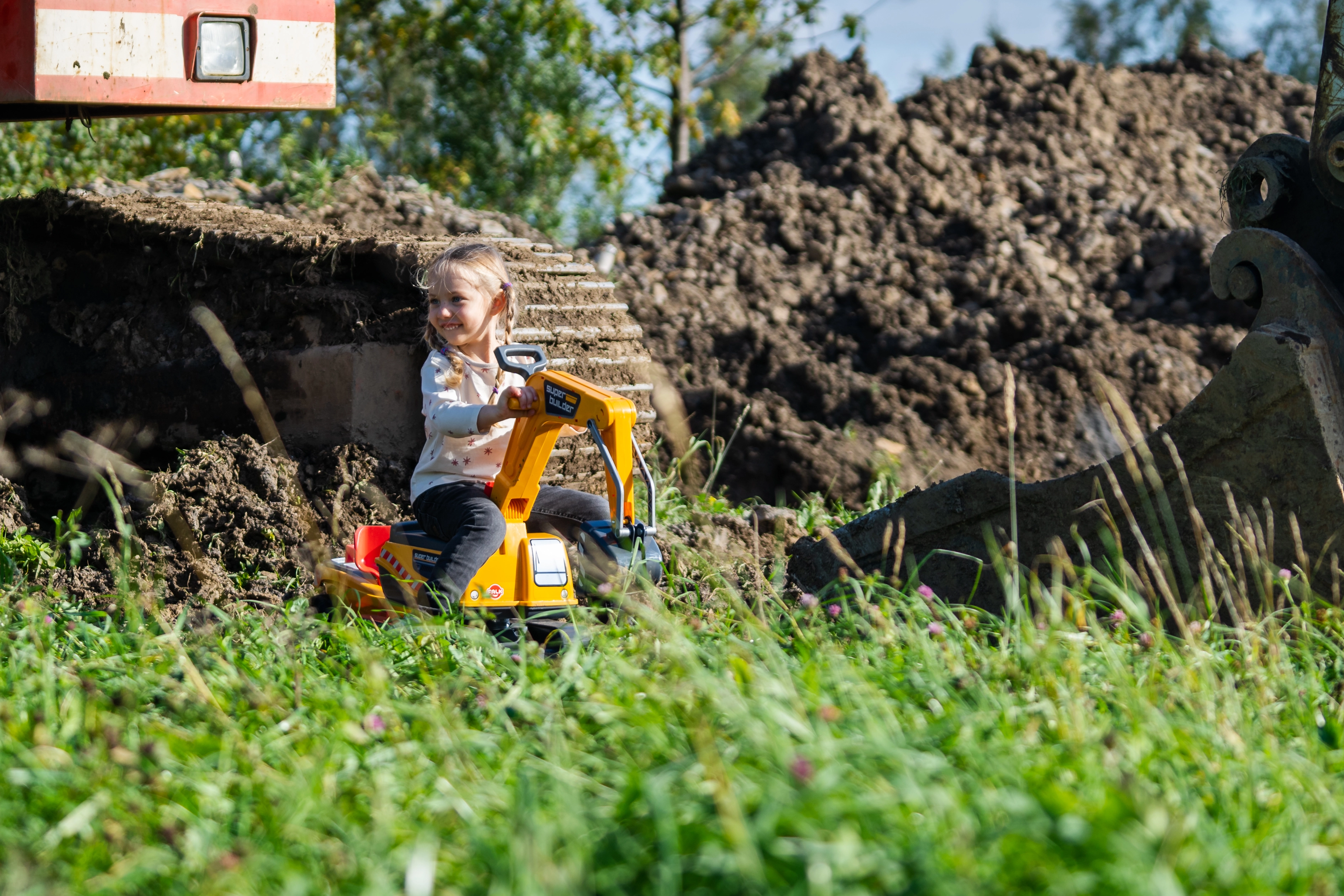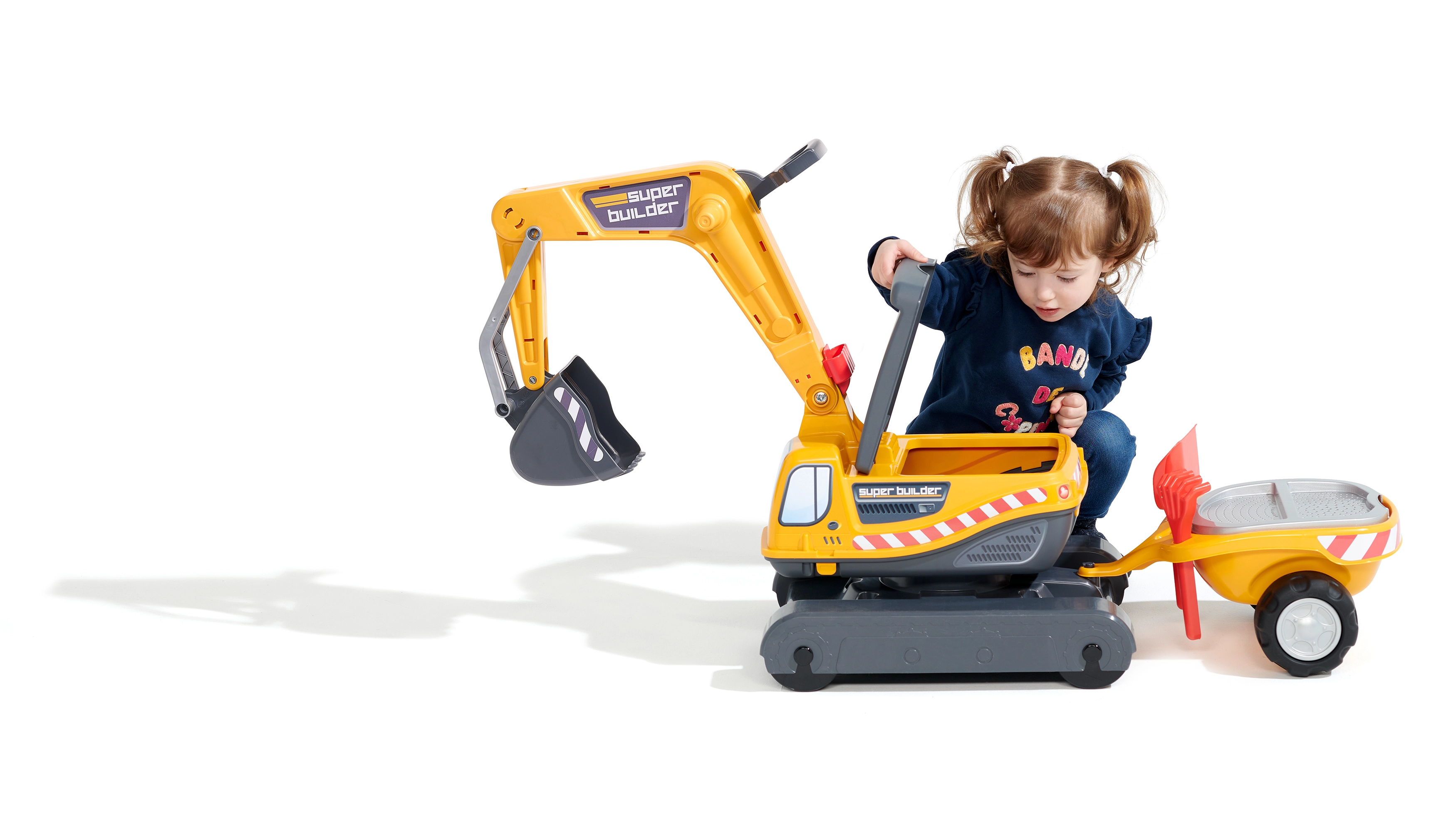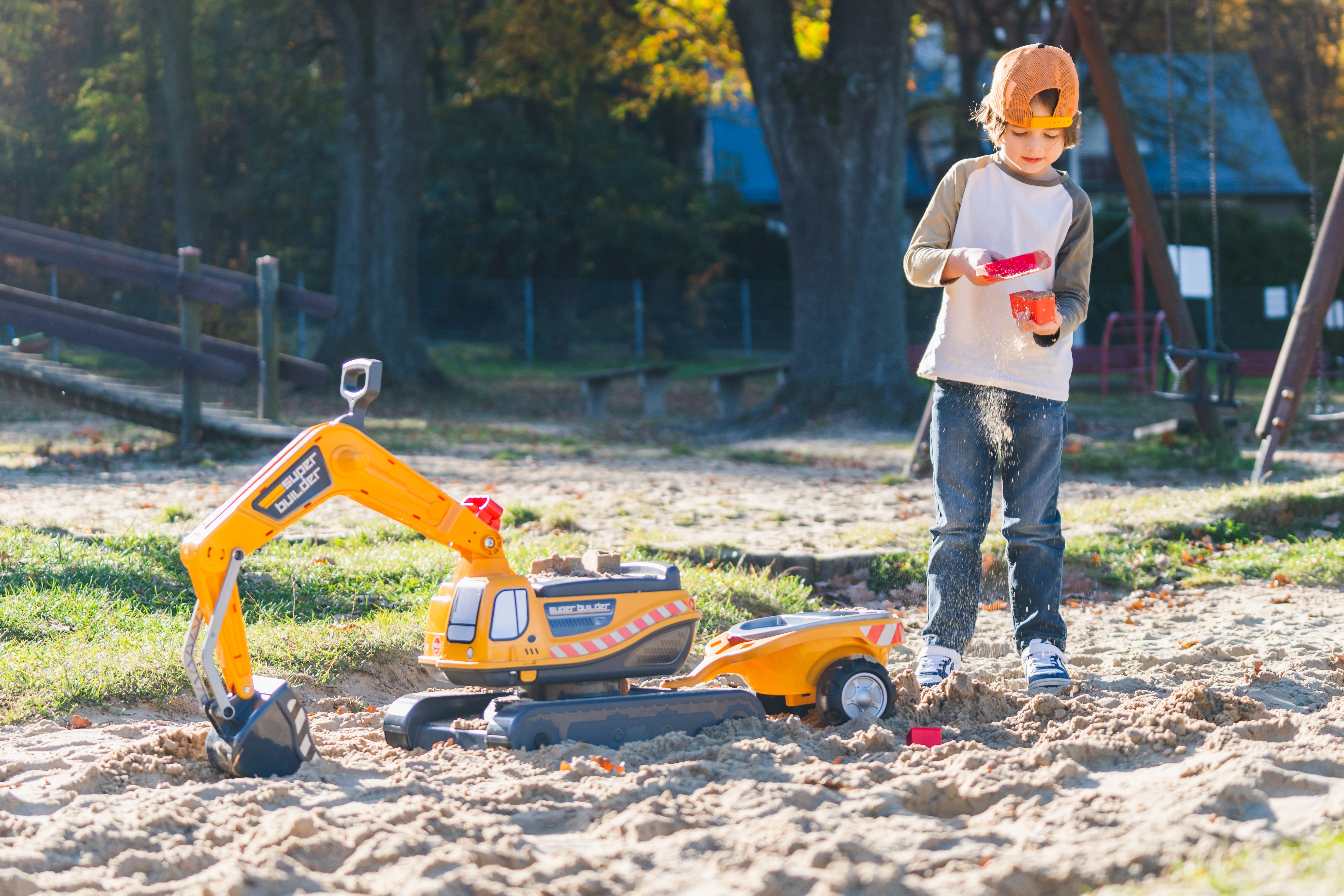 Poganjalec Super gosenicasti bager v oranžni barvi s funkcionalno žlico, imitacijo gosenic, prikolico in igralnim kompletom za pesek – 2× modelček v obliki opeke, lopatka in grabljice. Iz visokokakovostne in odporne plastike. Velikost 85×38×67 cm. Starost 3+. Vsi traktorji Falk so testirani do 50 kg – v skladu z zahtevami evropskih standardov. Izdelano v Franciji.
