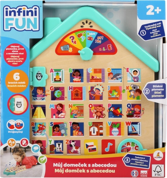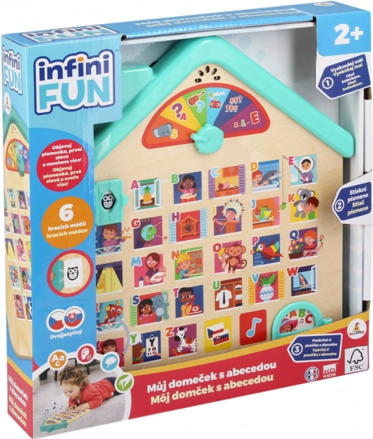 Ta izobraževalna lesena hišica otroke na igriv način seznani z abecedo in osnovnimi besedami. Zahvaljujoč govorjenim navodilom v češčini in slovenščini se otroci zlahka znajdejo, odkrivajo črke in jih povezujejo z veselimi slikami. Elektronske funkcije na baterije prinašajo zvoke, melodije in veselje do učenja.