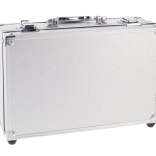 Srebrn kovček z zapirali in čvrstim ročajem ščiti kozmetiko ter olajša prenašanje doma in na poti.