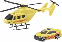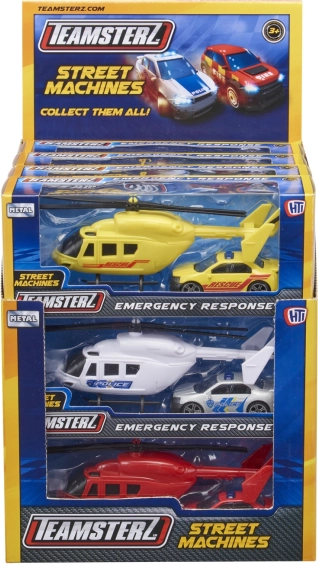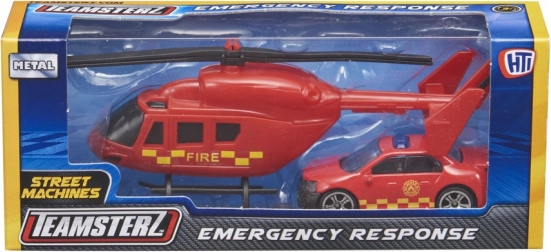 Komplet TEAMSTERZ združuje zabavo in vzdržljivost: podrobno izdelan helikopter z ročno vrtljivimi rotorji ter akcijsko intervencijsko vozilo s prosto vrtečimi se kolesi. Zahvaljujoč kovinskemu (tlakovno litemu) ogrodju in kakovostnim plastičnim delom bodo otroci uživali v realistični igri na policijo, gasilce in reševalce.
