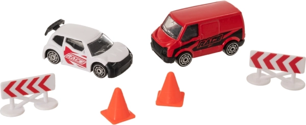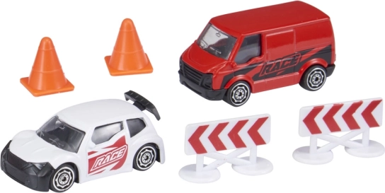 Komplet vključuje dirkalni avtomobilček, podporni kombi in cestne dodatke (2 stožca, 2 zapori), tako da lahko otroci takoj postavljajo proge in začnejo z dirkanjem.