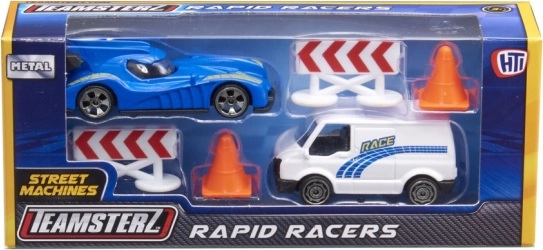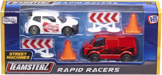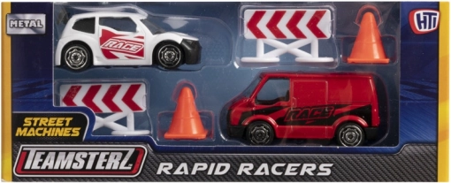 Pripravite se na dirke doma in na poti. Komplet TEAMSTERZ RAPID RACERS združuje realistično izdelan kovinski avtomobilček in dirkalni podporni kombi z dodatki, s katerimi si otroci zlahka postavijo lastno progo in preizkusijo različne dirkalne scenarije. Kompaktna velikost 3″ je idealna za majhne roke in zbiratelje.