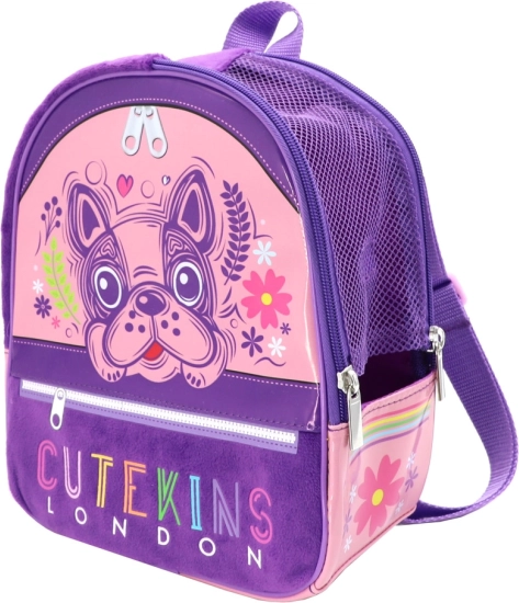 Otroški nahrbtnik CUTEKINS ima sprednji žep na zadrgo, mrežast stranski žep za stekleničko in udobne naramnice.