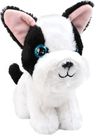 Plišasti kužek s črno-belim kožuhom in velikimi očmi je prijeten na dotik ter idealen za crkljanje in igro.