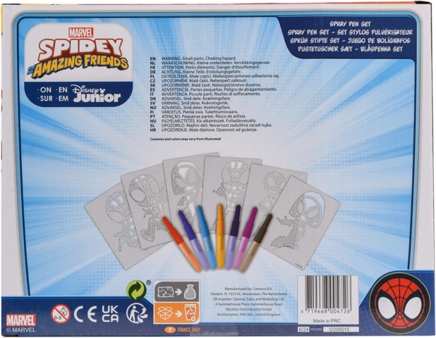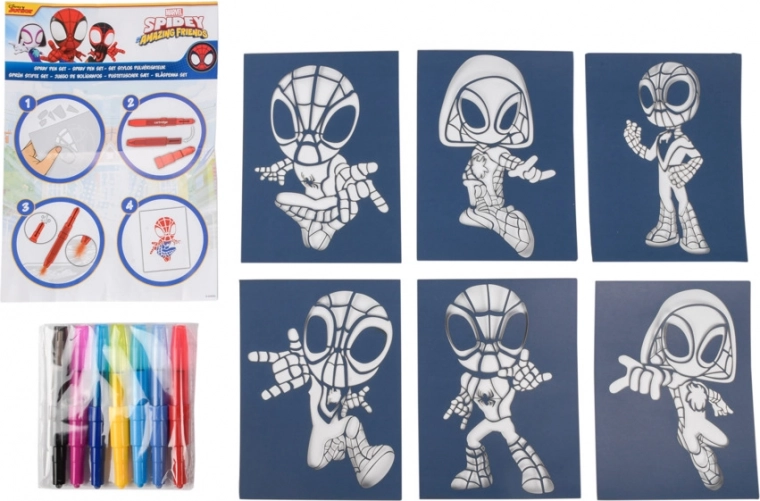 Barvanje z vpihovalnimi flomastri Spidy – vsebuje 7 vpihovalnih flomastrov in 6 šablon s slikami.