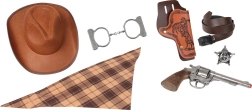 S tem setom dobite vse, kar potrebujete za popolno kavbojsko izkušnjo: klobuk, torbico za revolver, ruto, lisice, šerifovo značko in eleganten srebrn revolver.