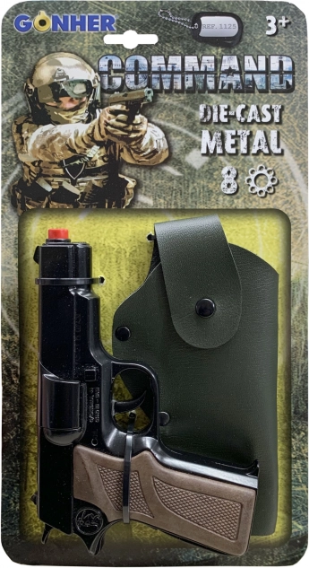 Policijska pištola Command je popolna igrača za male varuhe reda. Ta osemstrelna kovinska pištola ponuja realističen videz in je poleg tega dobavljena s usnjeno futrolo za enostavno nošenje.