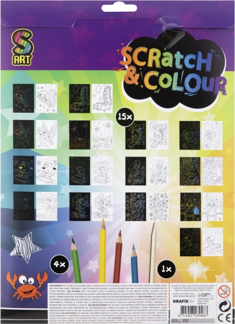 Ta vsestranski kreativni komplet prinaša otrokom ure zabave. Vsak od 15 listov formata A5 ponuja na eni strani magično praskanje motivov in na drugi strani pobarvanke. Priložena so tudi potrebna orodja, zato se lahko ustvarjanje začne takoj.