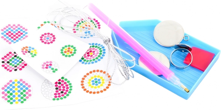 Komplet vsebuje 8 barv kamenčkov, osnovo za obesek in prstan, vrvico, 9 šablon za obeske, 4 šablone za prstane, podlogo in aplikacijsko pisalo – samo odprite in ustvarjajte.
