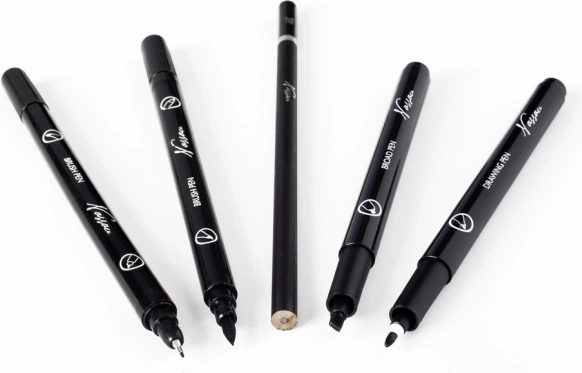 Vključuje dva dvojna flomastra s kombinacijo brush tip in fine tip 1 mm za raznolike poteze, grafitni svinčnik 3H za skice in osnutke, okrogli marker 1 mm za enakomerne linije ter kaligrafski marker 3 mm za izrazite patkaste poteze. Komplet je idealen za bullet journal, vabila, voščilnice, ilustracije in tehnične skice.