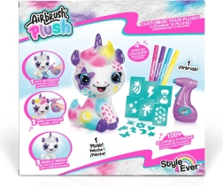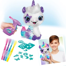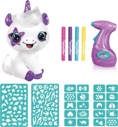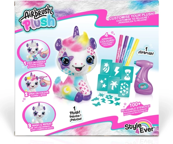Odkrij magijo lastnega dizajna s tem ustvarjalnim kompletom: plišasti samorog, airbrush orodje, 3 barvni vložki, 120 samolepilnih šablon in zaščitne rokavice. Svojega ljubljenčka lahko poljubno popršiš, opereš v hladni vodi in začneš znova – neskončna zabava za otroke od 6 let. Potrebuje 2× AA bateriji (nista priloženi).