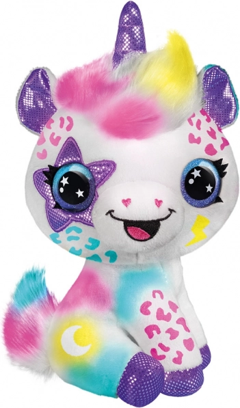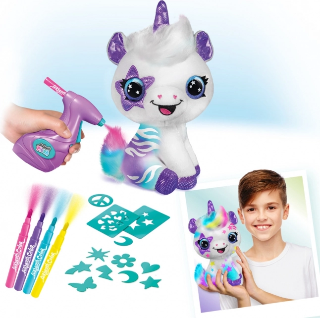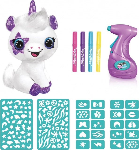 Spremeni belega plišastega samoroga v izvirno umetnino. Z enostavnim airbrush orodjem in samolepilnimi šablonami ustvari zvezde, srčka in barvne prehode. Ko želiš spremembo, ga preprosto obriši ali operi v hladni vodi in lahko ustvarjaš znova.