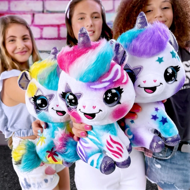 Preprosto pršenje barv na plišastega samoroga s pomočjo šablon ali prosto iz roke. Odlično za začetnike in male umetnike.