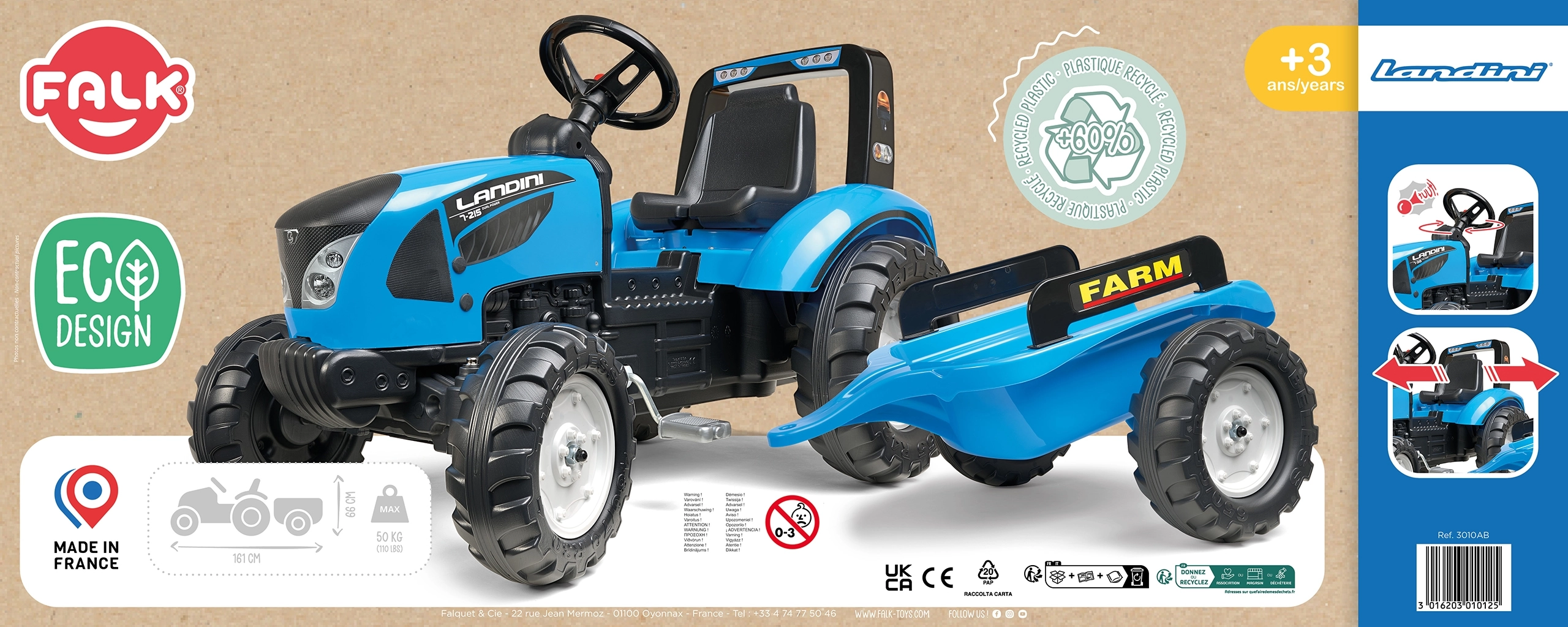Poganjalni traktor LANDINI je skrbno izdelana igrača iz visokokakovostne plastike, ki zlahka prenese vsakodnevne otroške dogodivščine na vrtu in igrišču. Realistični detajli, kot so sprednji »žarometi«, robustna kolesa in prikolica z napisom »FARM«, poudarjajo avtentičen videz pravega traktorja.