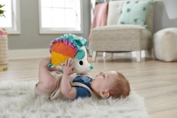 Lahkega, mehkega ježka je enostavno držati v malih ročicah, nanj pa lahko pripnete dodatne igrače za voziček ali avtosedež.
