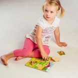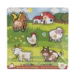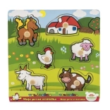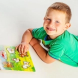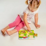 Lesena vstavljanka farma je idealna igrača za majhne otroke, ki razvija fino motoriko in prepoznavanje živali s pomočjo barvnih delcev z ročaji.