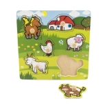 Ta vstavljanka vsebuje skupno 5 barvnih živali, vključno s konjičkom, kozo, ovčko, kokoško in kravo, ki so zaradi majhnih lesenih ročajev zlahka prijemljive. Vsak delček ima svoje mesto na leseni podlagi, kar prav tako pomaga otrokom naučiti se pravilnega umestitve vsakega delčka.