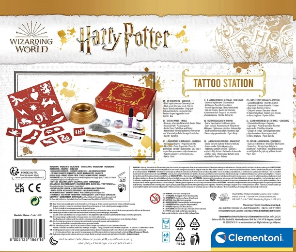 Spremenite svoj slog v čarovniškega s tetovažnim studiem HARRY POTTER znamke Clementoni. Komplet vsebuje vse za ustvarjanje začasnih tetovaž – od bleščic in šablon do posebnega aplikatorja v obliki čarovniškega peresa. Vse shranite v praktičen kovček, tako da boste svoje čarobne dodatke vedno imeli pri roki.
