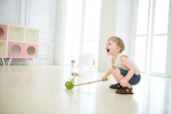 Ta potisni voziček pomaga otrokom izboljšati tehniko hoje in podpira njihovo ravnotežje.
